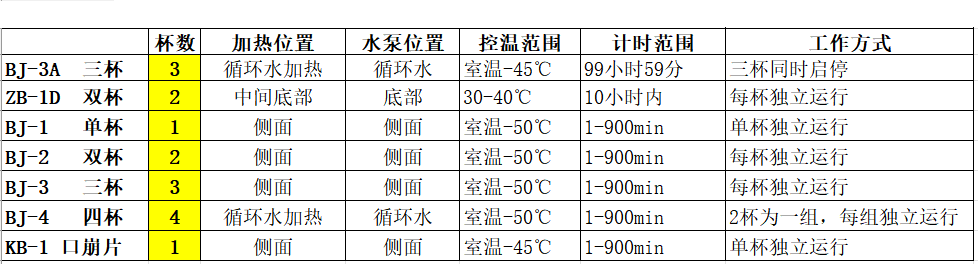 7種型號對比表